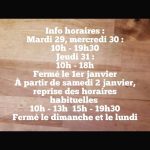 Bonjour, nous sommes ouvert le mardi 29 et mercredi 30 de 10h à 19h30. Le jeudi 31 de 10h à 18h. Vendredi 1er Fermé. A compter du samedi 2 janvier, reprise des horaires habituelles: 10h – 13h 15h – 19h30. Fermé le dimanche et le lundi. Belle fête de fin d’année à tous! Esther et …