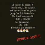 Bonjour à tous!! L’Escapade élargi ses horaires pour les fêtes !!! À partir du 8 décembre, L’Escapade est ouvert tous les jours jusqu’au 31 décembre. Du lundi au samedi : 10h – 19h30 Le dimanche :10h – 18h Fermé le 25 décembre. Les livraisons sont toujours assurées sauf les 23, 24 et 31 décembre. À …