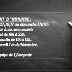 Du vendredi 27/10/17 au dimanche 5/11/17: Votre cave, bar à vin sera ouvert: de 11h à 13h et de 16h à 22h. Le dimanche matin de 11h à 13h. Fermé le mercredi 1 er de Novembre. A bientôt, l’équipe de L’Escapade